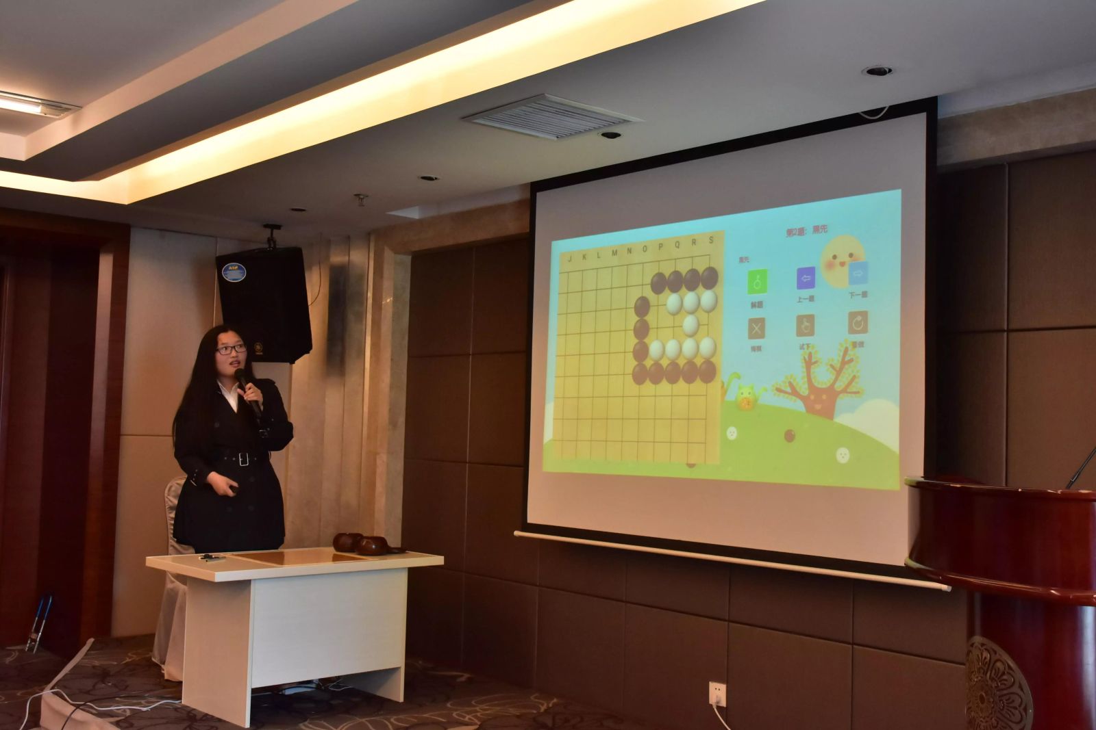湖南隐智科技有限公司产品顾问黎鹤群,正在进行“电子棋盘及隐智少儿平台的功能演示”。