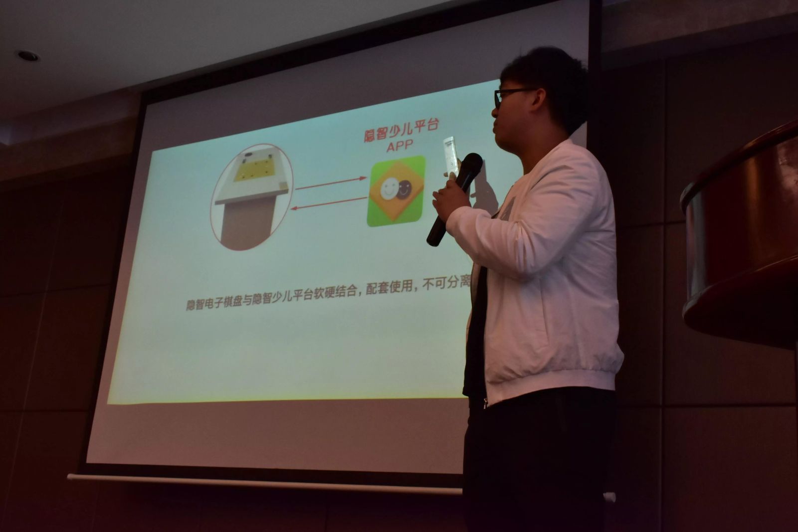 湖南隐智科技有限公司销售部负责人丁一舟,正在进行“电子棋盘以及隐智少儿平台营销模式”讲解。